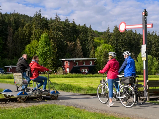 Mit Muskelkraft auf Schienen unterwegs. Am Affolderner See entlang, zwischen Affoldern und Hemfurth.