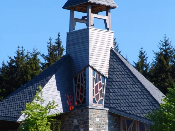 Der Architektur liegt die Silhouette eines beschützenden Hirten zugrunde. Grauwacke aus Dainrode, Sauerländer Schiefer, Fichten- und Lärchenholz aus dem Kellerwald sind, kombiniert mit blütenähnlichen Farbfenstern, zu einem Kunstwerk vereint.