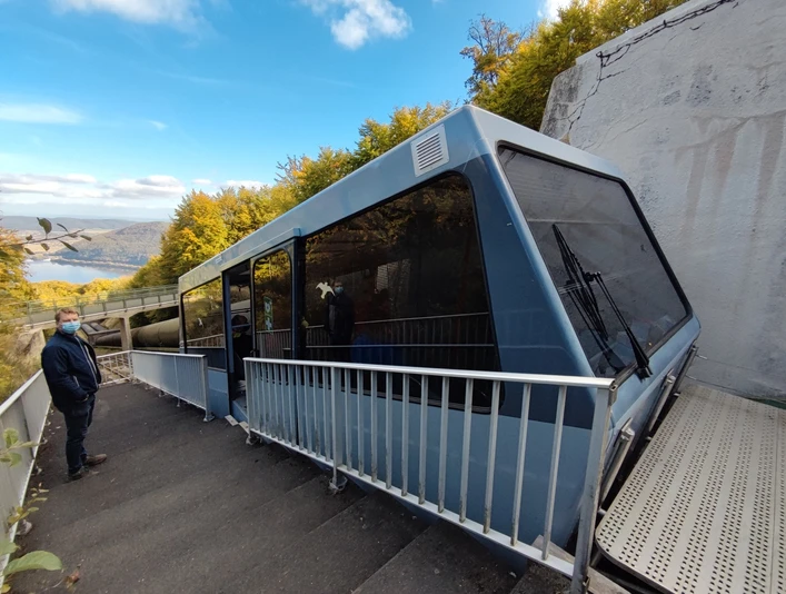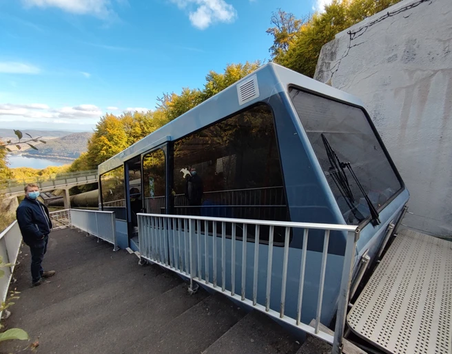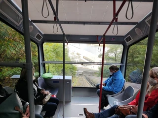 Die Standseilbahn zum Peterskopf ist eine Kabine mit einem Fassungsvermögen von 54 Personen.