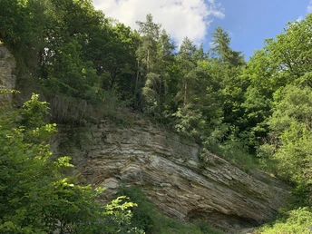 Ein besonderes Highlight erwartet Euch nach der zweiten Überquerung: der Steinbruch „Kleine Leuchte“ mit seiner beeindruckenden Kieselschiefer-Falte, die einen Blick in die Erdgeschichte ermöglicht. Zahlreiche Bänke und Sitzgruppen entlang des Weges laden zu gemütlichen Pausen ein, bei denen Ihr die Natur genießen könnt.